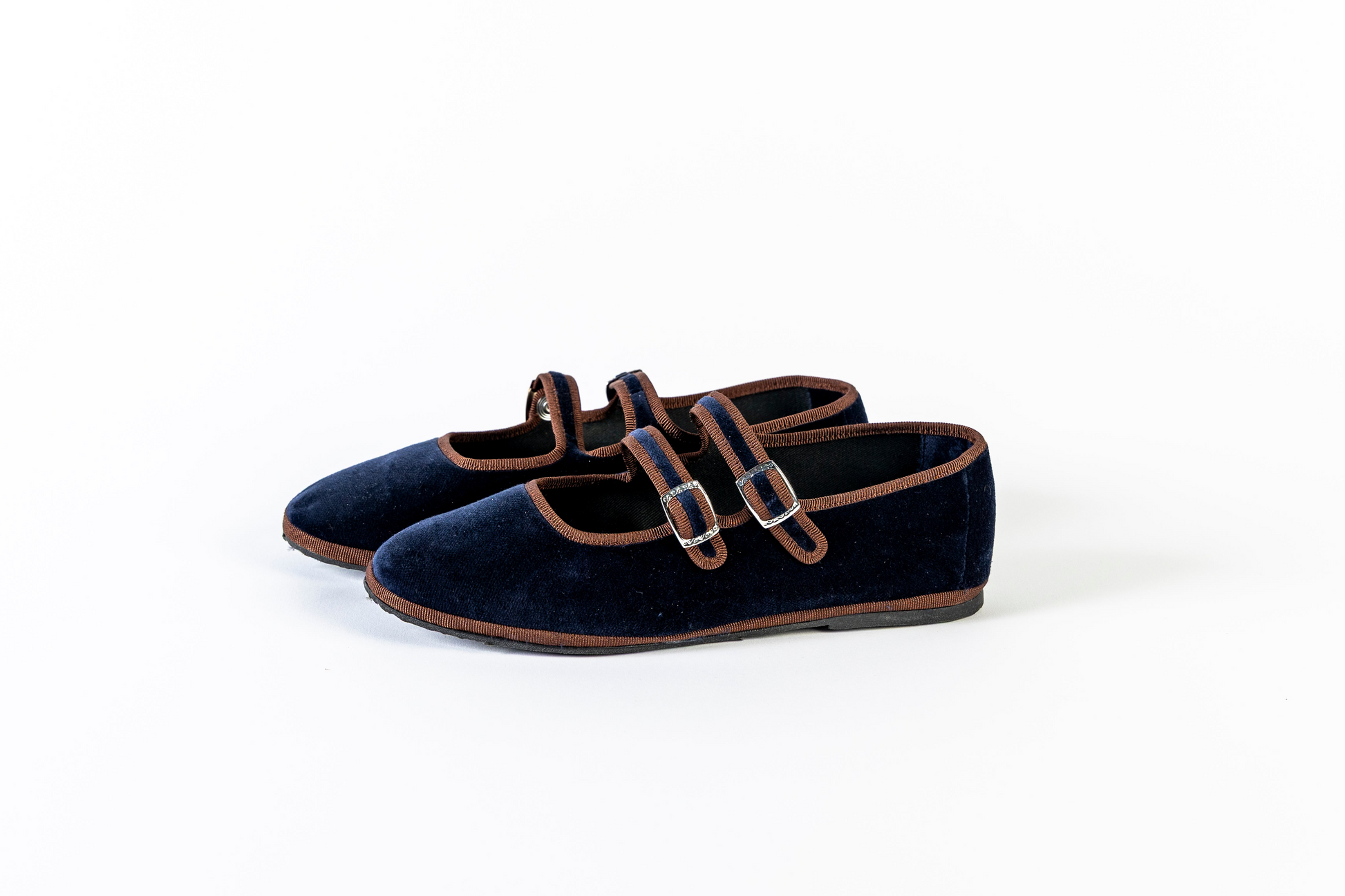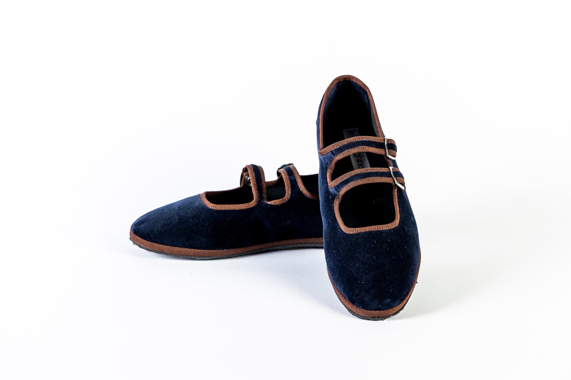 Maryjane doppio laccio in velluto blu scuro con bordo marrone