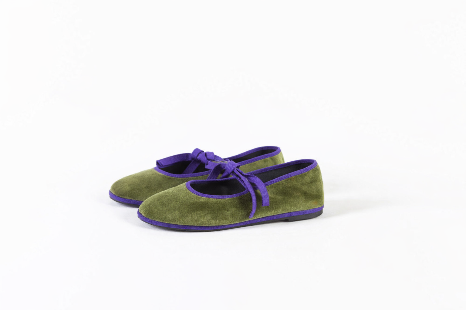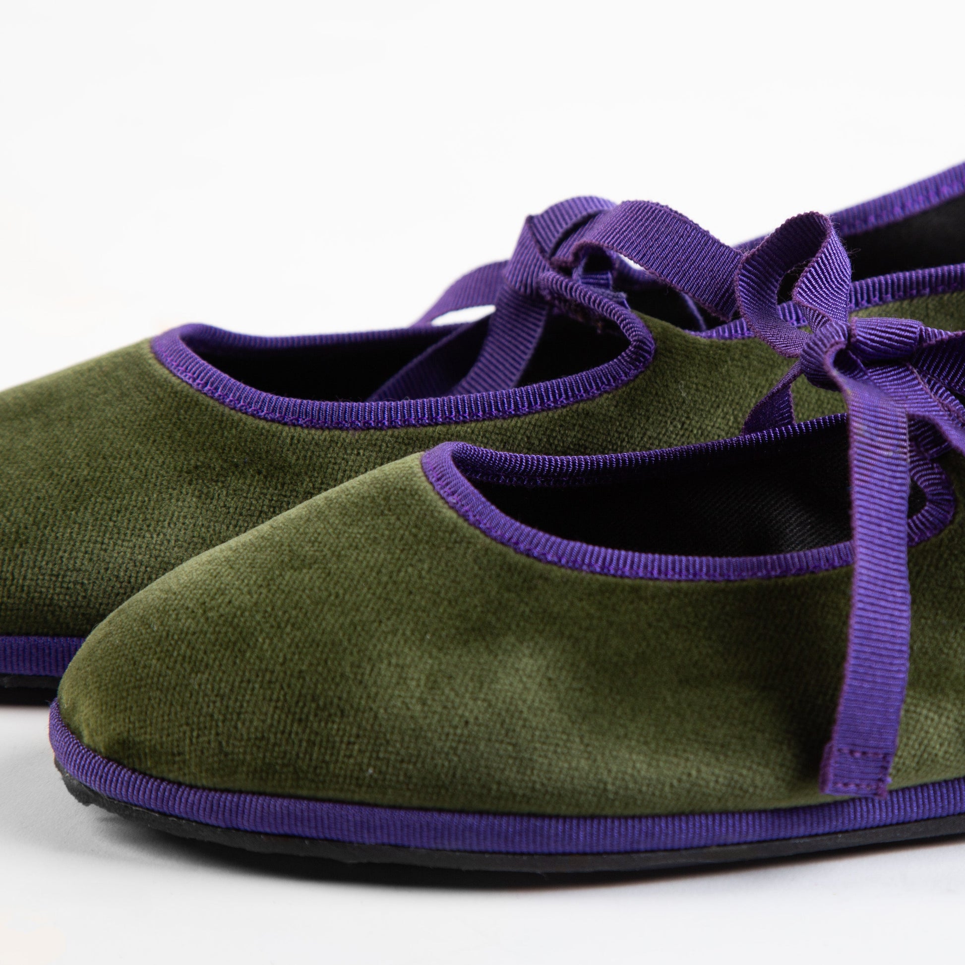 Meneghine con fiocchetto in velluto verde oliva con bordo viola