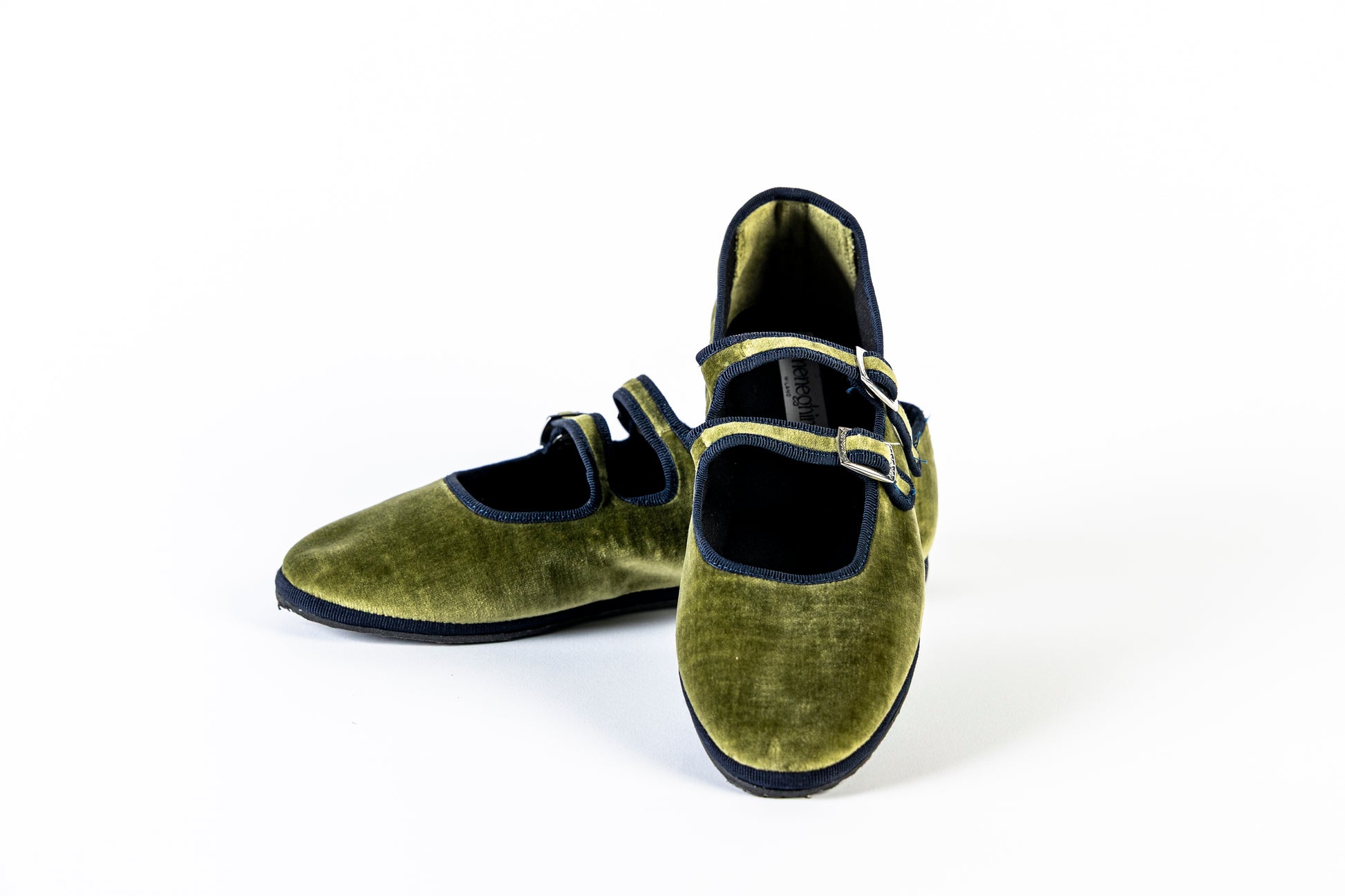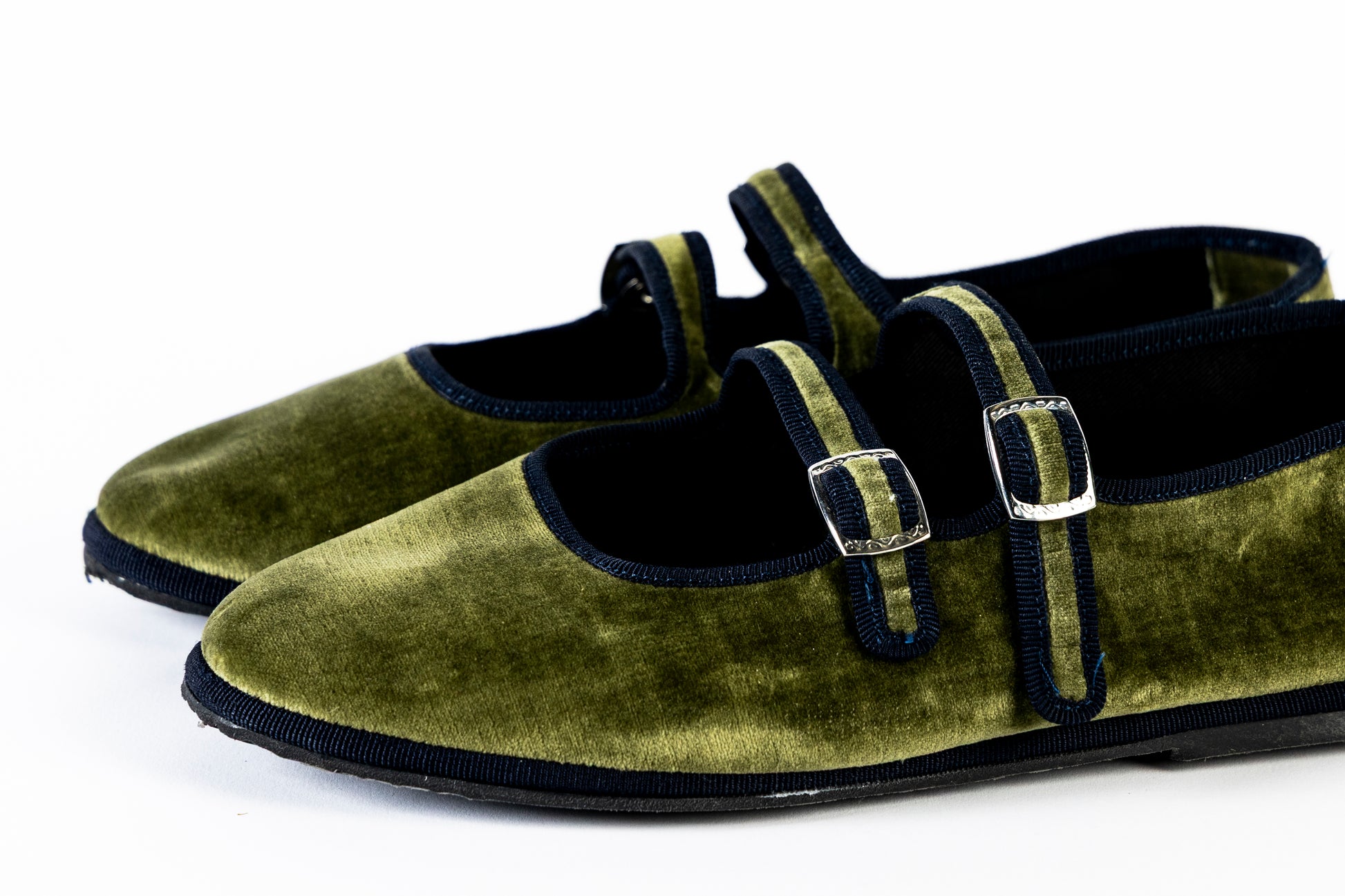Maryjane doppio laccio in velluto verde oliva con bordo blu
