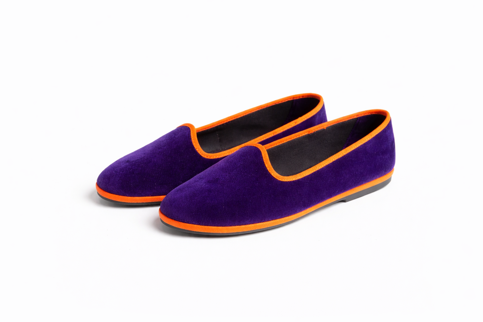 Friulane in velluto viola con bordo arancione.